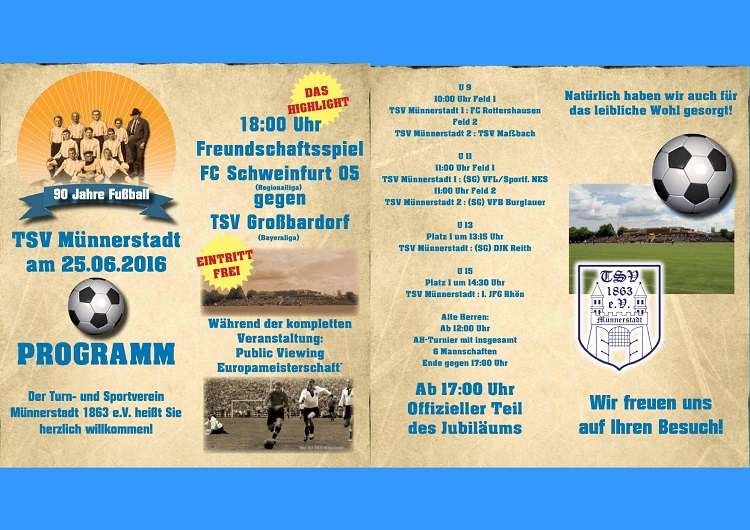 Der 25. Juni steht beim TSV ganz im Zeichen des Fußballs. Dieser kann in unserem Sportverein nämlich bereits auf eine 90-jährige Geschichte zurückblicken. Ein Grund für uns, dieses Jubiläum gebührend zu feiern und am Sportzentrum ein besonderes Highlight zu bieten.