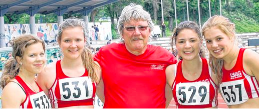 Gleich zu Beginn der Veranstaltung machten Lara Mahlmeister, Deborah Adam, Luisa Ruck und Luisa Zeitz ihrem Trainer Bernd Neumann das von ihm erhoffte Geschenk zum 65. Geburtstag. Der Mürschter Trainer, der mittlerweile auf mehr als 30 erfolgreiche Jahre Trainertätigkeit zurückblickt und im Nachwuchsbereich schon Athleten zu internationalen Spitzenplätzen führte, war vollauf begeistert über den Auftritt seines Staffel-Quartettes. Mit blitzsauberen Wechseln gewannen die Schülerinnen sicher vor dem Team vom LAZ Obernburg Miltenberg und der LG Karlstadt-Gambach-Lohr. „Das war ganz große Klasse, was die Mädels da abgeliefert haben“, freute sich Bernd Neumann. In 51,35 Sekunden rannten die TSVlerinnen die bis dato drittschnellste Zeit in Bayern. Für die Teilnahme an den Deutschen Meisterschaften der Schüler in Köln fehlen nur noch 35 Hundertstel Sekunden.