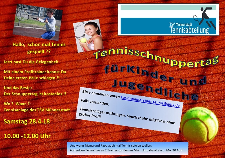 Auch in diesem Jahr bieten unsere Tennisler zur Saisoneröffnung Tennisschnuppertage für Kinder/Jugendliche sowie Erwachsene an.