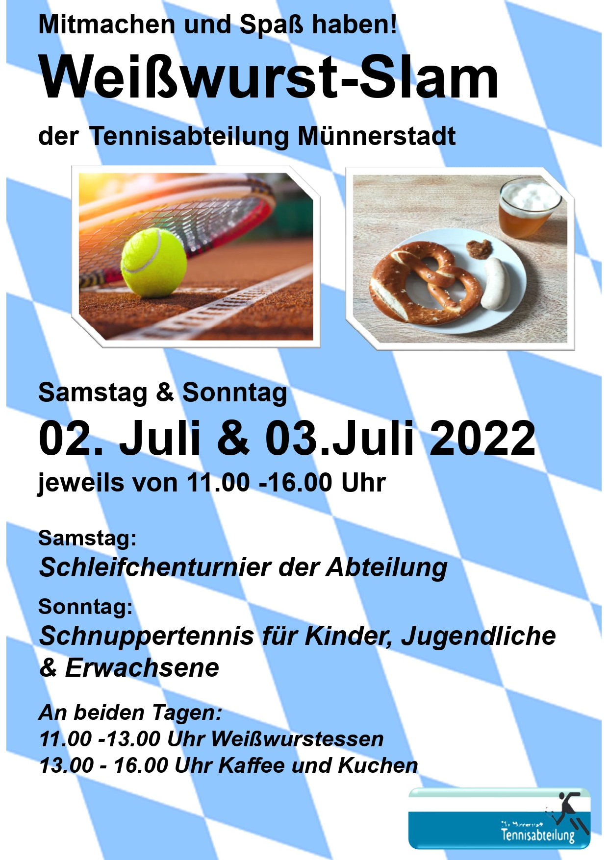 Am Sonntag wird es die Möglichkeit geben, mit unserem Trainer Raschid an einem Familientennistraining ab 11 Uhr teilzunehmen, ab 11 Uhr sind auch Freunde und Bekannte, Alt und Jung eingeladen zu einem kostenlosen Schnuppertennis und natürlich zum Weißwurstessen.