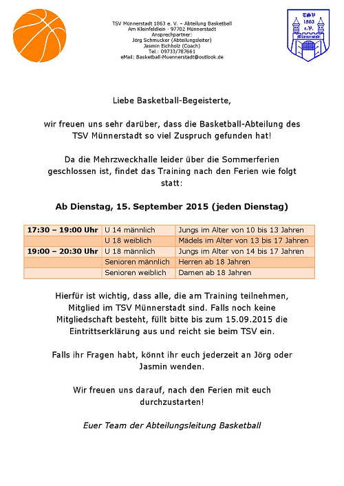 Bitte beachtet, dass ihr bei Teilnahme an den folgenden Trainings in erster Linie aus versicherungstechnischen Gründen bis zum 15. September die Eintrittserklärung in den TSV unterzeichnet und uns zukommen lasst, wenn ihr nicht ohnehin bereits Mitglied im TSV seid.