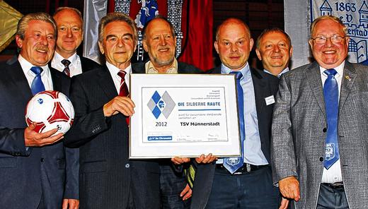 (riz) Ein besonderer Höhepunkt des Kommersabends zum 150-jährigen Bestehen des TSV Münnerstadt war die Verleihung der silbernen Raute des bayerischen Fußballverbandes an die Fußballabteilung des TSV durch den Kreis-Ehrenamtsbeauftragten Georg Stöth. Um diese Auszeichnung zu erhalten, würden ehrenamtliches Engagement, Jugendarbeit, Breitensport und Prävention verlangt, so Stöth. Er betonte: „Der TSV Münnerstadt hat im sportlichen und im gesellschaftlichen Bereich sehr viel getan.“ Bei der Verleihung der Silbernen Raute: (von links) TSV-Co-Vorsitzender Gerd Zeitler, Bürgermeister Helmut Blank, Kreis-Ehrenamtsbeauftragter Georg Stöth, Ehrenvorsitzender Peter Will, Co-Vorsitzender Günter Scheuring, Landrat Thomas Bold und Ehrenvorsitzender Karl Scharf.