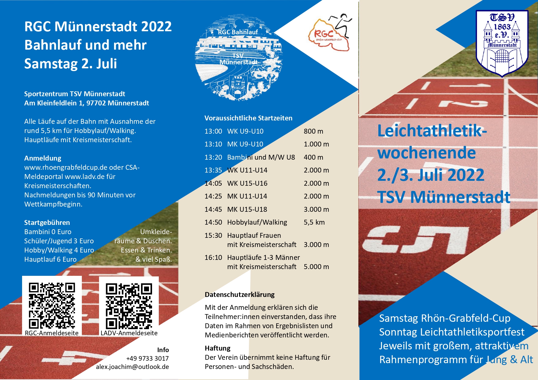 Adrian Roos vom VfL Sportfreunde Bad Neustadt setzte sich über die 800 Meter der M 14 durch. Seine Siegerzeit für die zwei Runden betrug 2:27,61 Minuten und damit eine neue persönliche Bestleistung. Teamgefährtin Leni Dufour rannte die 800 Meter in 2:43,36 Minuten und wurde in der Altersklasse W 14 Vierte. Helen Stahl vom TSV Münnerstadt wurde bei ihrem Debüt über die 400 Meter der U 18 in 66,70 Sekunden gestoppt und stand in der Ergebnisliste vorne. Im Weitsprung landete sie mit ihren 4,68 Meter auf Rang drei.
